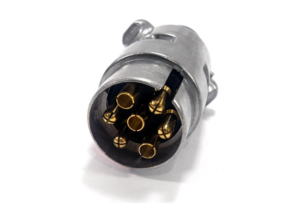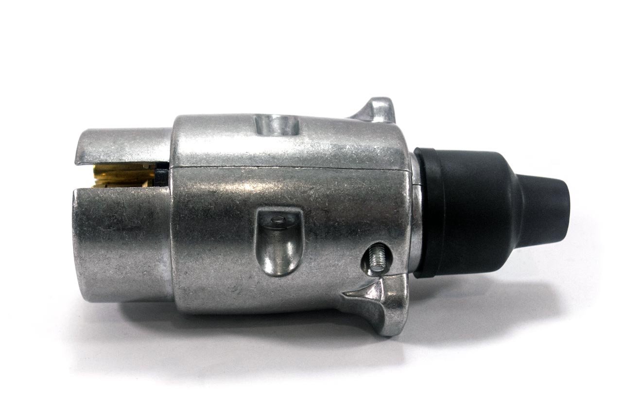 Fisa remorca cu 7 pini. Priza este universală, deci se potrivește la orice tip de remorci ușoare, platforme auto, etc. Carcasa este din aluminiu. Este echipată cu conector de 12 V și cu pini din metal antioxidant.